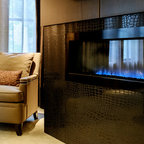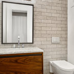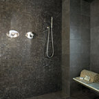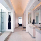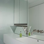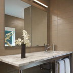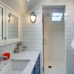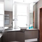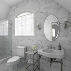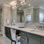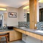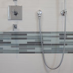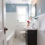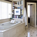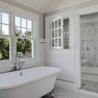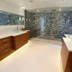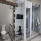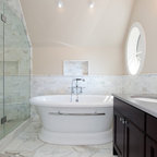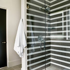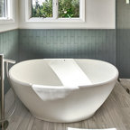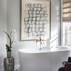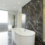 Пример оригинального дизайна интерьера: ванная комната в современном стиле с отдельно стоящей ванной, черной плиткой и серой плиткой — Houzz